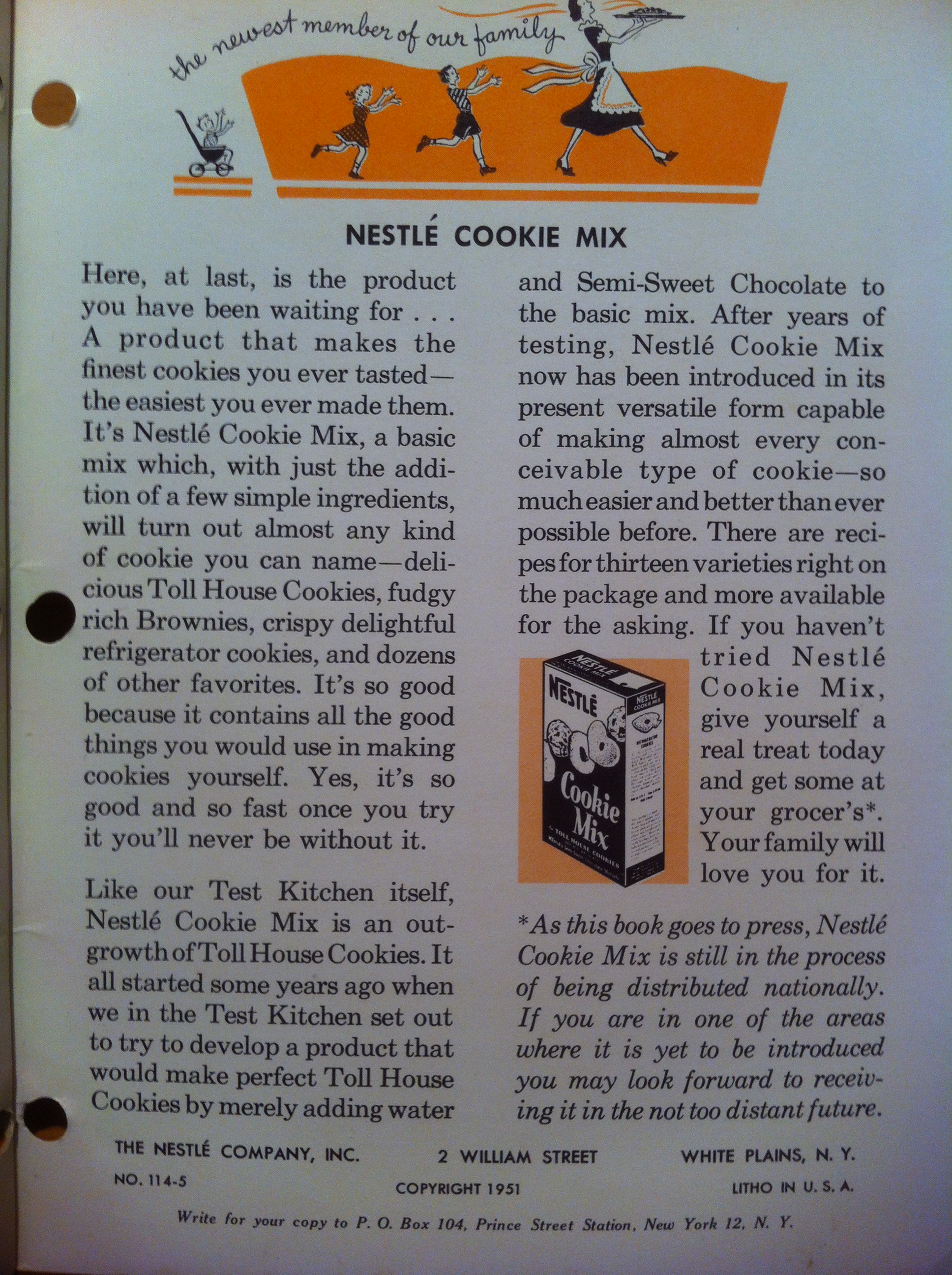 But let’s get back to those branded cookbooks. About 20 years after the creation of the Toll House Cookie, Nestlé, like Kraft, distributed short, paperback cookbooks. One of those cookbooks in particular, published in 1951, contains the story of how the Toll House Cookie came to be, and an ad for one of Nestlé’s (at the time) newest products—Nestlé Cookie Mix. Oh yeah, and in between those things are a bunch of recipes, all of which call for Nestlé semi-sweet morsels.