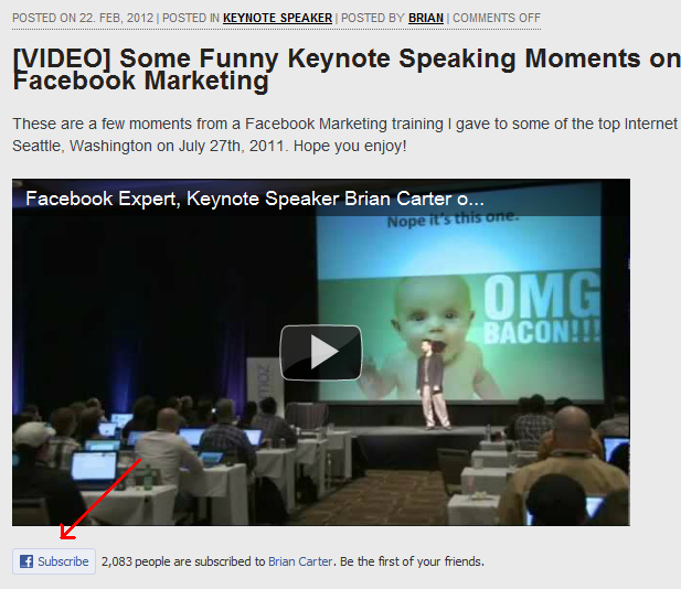 “I use a Subscribe button on all my posts on BrianCarterYeah.com — it’s at the bottom of every post. That’s kind of like some people using RSS subscriptions, but more people use Facebook than RSS readers, so I think this is a more effective approach to that kind of thing.”