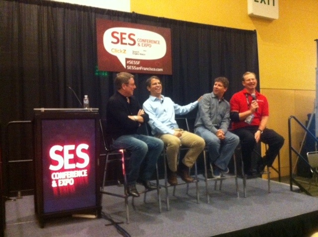 Danny Sullivan joins Mike and Matt on the stage. Mike calls it an historic moment since it’s the first time, and probably the last time these old timers of search will be together. Brett Tabke, founder of PubCon gets pulled up to the stage and now there’s a million combined years of search experience on the stage. It’s PubCon, SES, SMX and Google together on one 5’x10′ stage. Major props to SES for crossing the conference divide to deliver the very best of the search world in one unprecedented presentation.