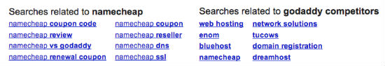 By calling out GoDaddy, NameCheap not only garnered mentions and links, but they were able to grab some real estate in the search results for the GoDaddy brand name. One year later, when you search NameCheap, you still see them being associated with GoDaddy in the related searches and competitive searches: