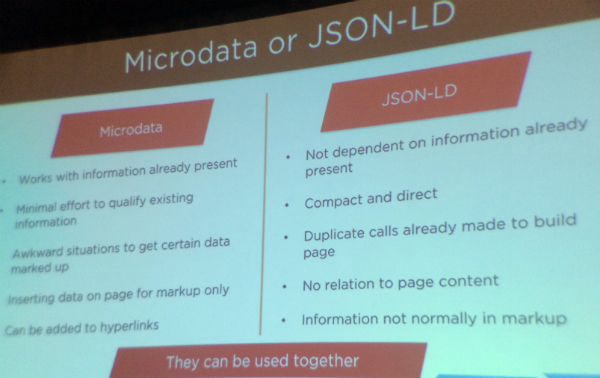 JSON is more compact. Your developers are going to understand it really well, it’s good for marking up data that’s not on the page, and you can mark up data that’s not text on the page.