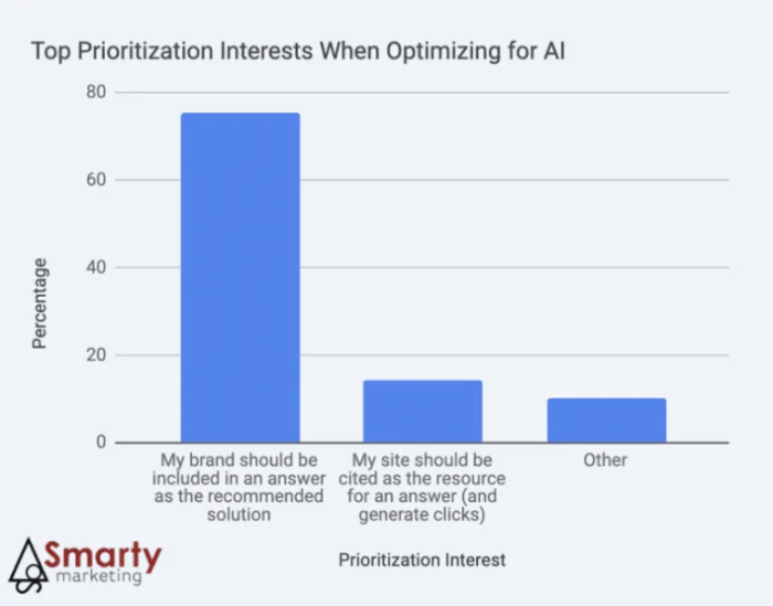 La ricerca di Smarty Marketing citata in precedenza conferma questa tendenza: circa il 76% degli intervistati preferisce che il proprio brand sia incluso nella risposta dell’IA come soluzione consigliata, anche se ciò non genera un clic immediato.